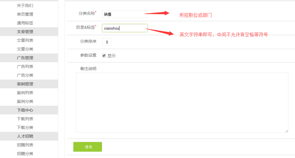 2、添加分类:如果有不同职位招聘,可以进行一下分类,可以点击招聘分类——添加分类