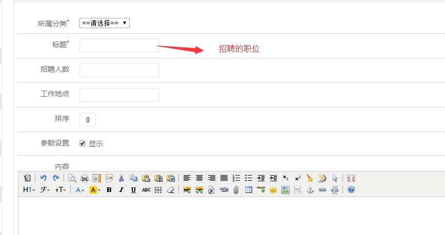 3、添加好分类后,单击招聘列表——点右上角“添加招聘”。其中*为必填项,其他项也尽量填上;编辑器内可以写招聘职责等内容。
